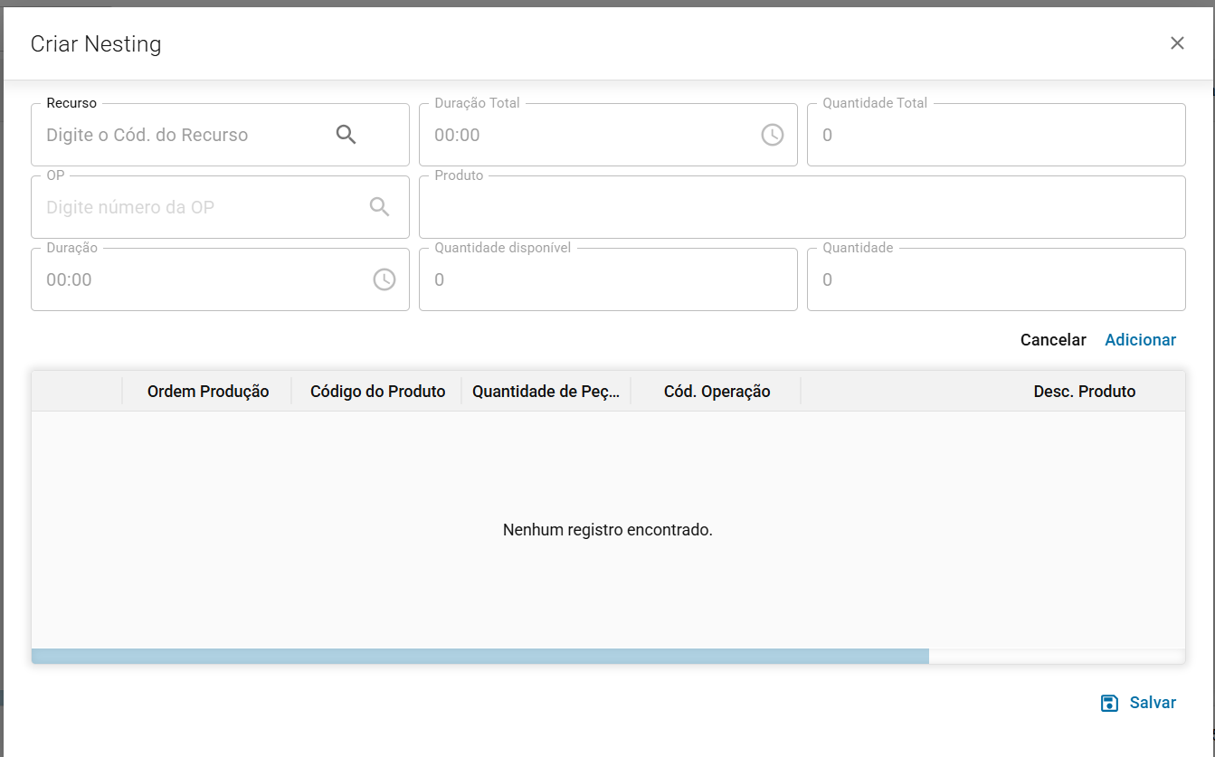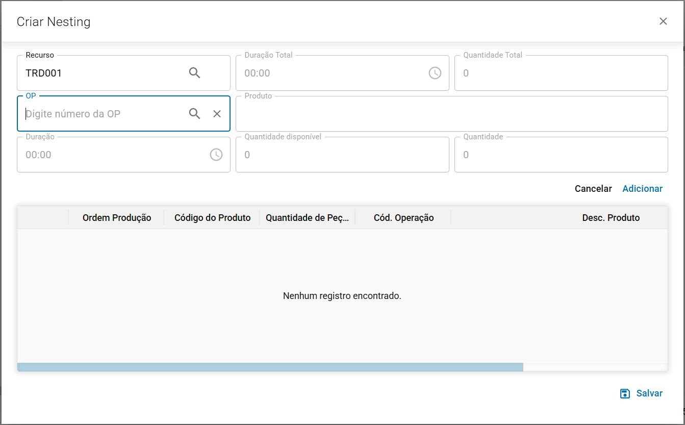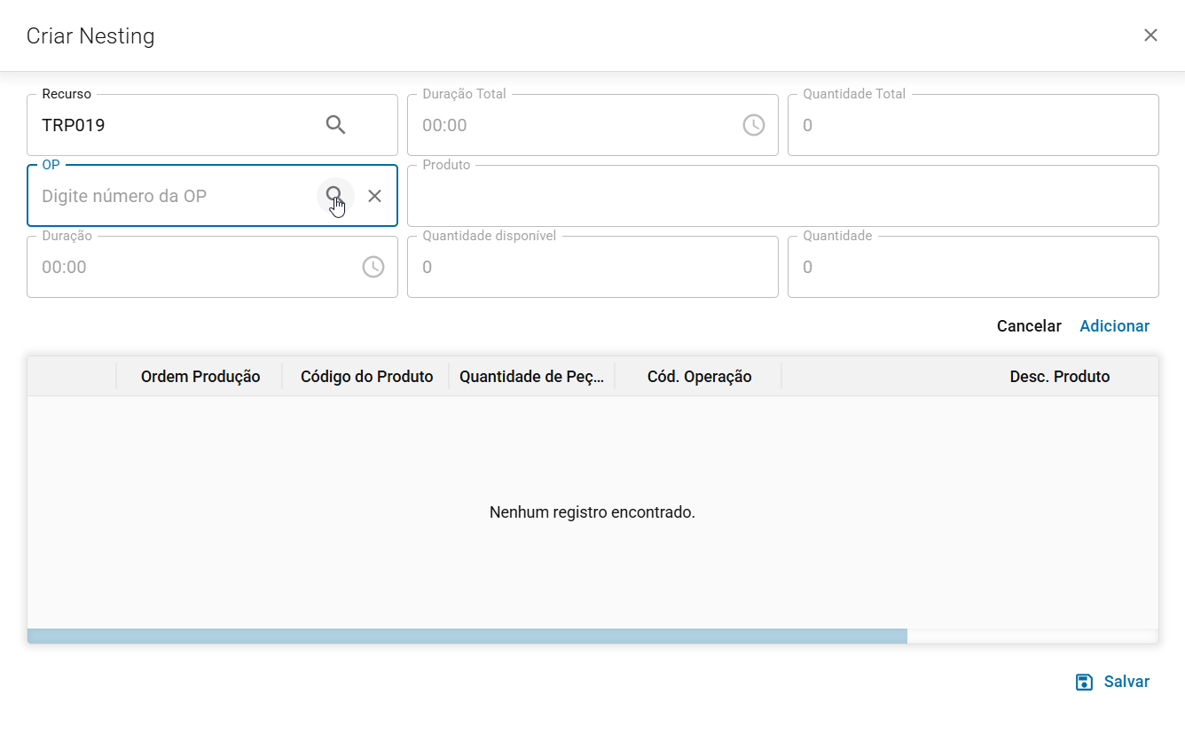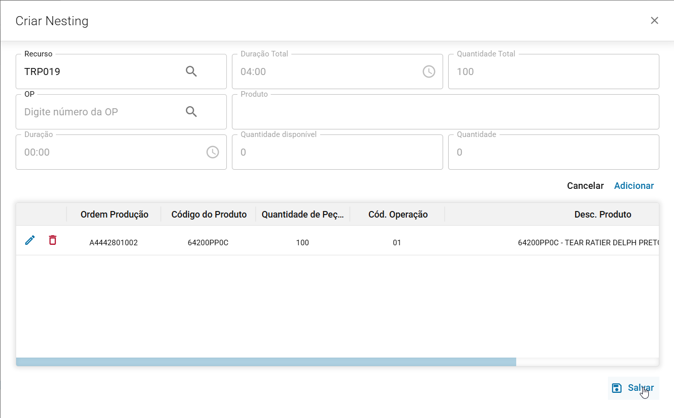 Seguir da mesma forma para demais OPs que serão agrupadas no mesmo nesting.
