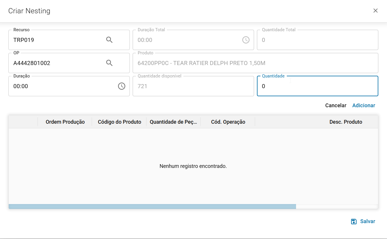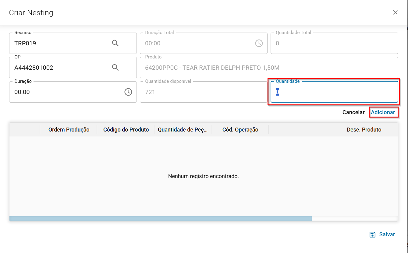 Informe a quantidade que será produzida dessa OP e clique em adicionar.