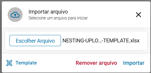 Na tela, é possível realizar a criação (Botão "+ Criar Nesting") ou importar de um arquivo modelo preenchido (botão "Upload"), assim como fazer apontamentos (tela do COCKPIT), edições ou excluir o nesting, caso necessário, através dos botões: