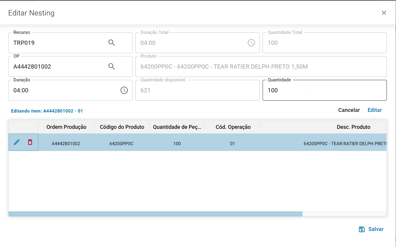 Para os casos de importação de arquivo, o nesting vem com status de não configurado e para isso, é necessário realizar a alteração dele.