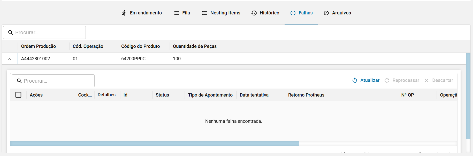 Nessa tela é possível conferir dados da OP, realizar os apontamentos, verificar a fila do recurso, o que está em andamento em tempo real, os itens do nesting, histórico, falhas e fazer uploads de arquivos necessários.