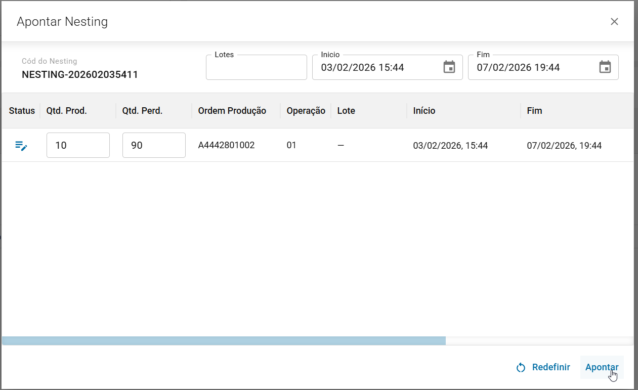 É possível acessar o apontamento, através do cockpit específico do Nesting, através do botão: