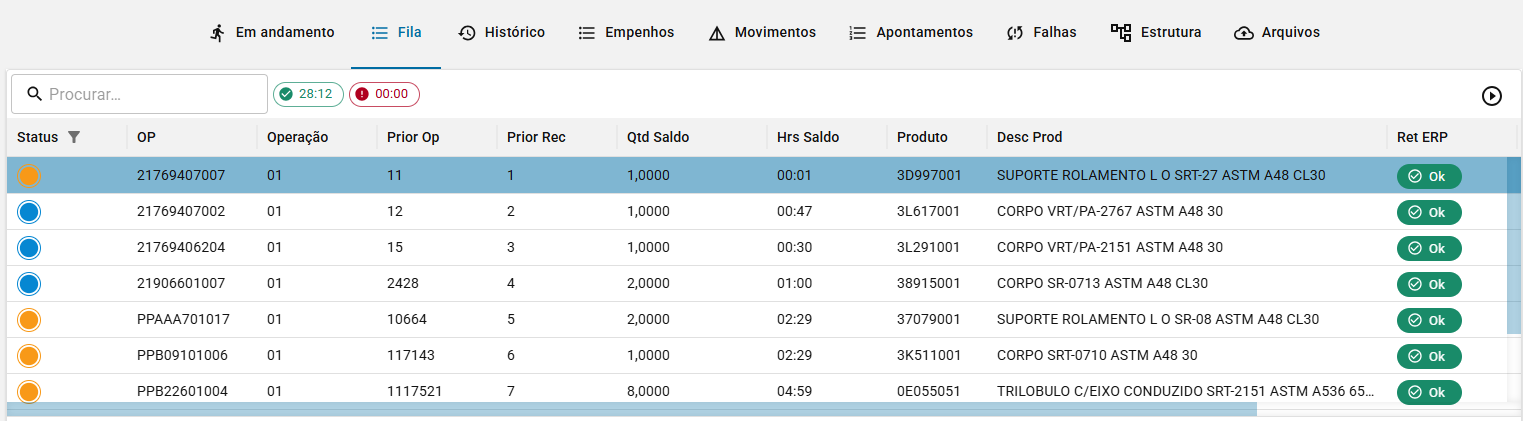 A Fila mostra tanto OPs paradas como em andamento, conforme imagem: